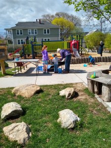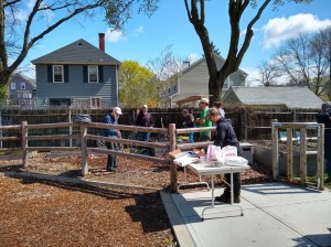 Gardeners, playground parents and kids, and neighbors came by to take part in cleaning up the park and getting the garden ready for the growing season by cleaning up beds, hooking up hoses, and spreading woodchips along the paths.